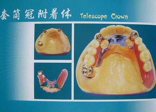 利用套筒冠的內外雙重冠結構,把假牙與基牙連接起來的修復形式。套筒冠由內冠和外冠組成,內冠粘固在基牙上,外冠與假牙其他組成部分連接成整體,義齒通過內冠與外冠之間的嵌合作用產生固位力,使義齒取得良好的固位 -