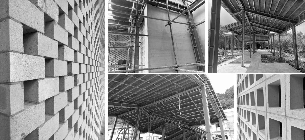 場地北側(cè)為茂盛的綠植山地,南臨彭白路,場地與道路高差較大。建筑年代較為久遠,部分圖紙缺失。設(shè)計之初我們對原始建筑進行了細致的測量及勘探。建筑原始結(jié)構(gòu)為框架結(jié)構(gòu),建筑兩側(cè)有局部搭建空間,其結(jié)構(gòu)耐久性不滿足新建建筑要求,需對其中部分采用結(jié)構(gòu)加固的方式重新利用。